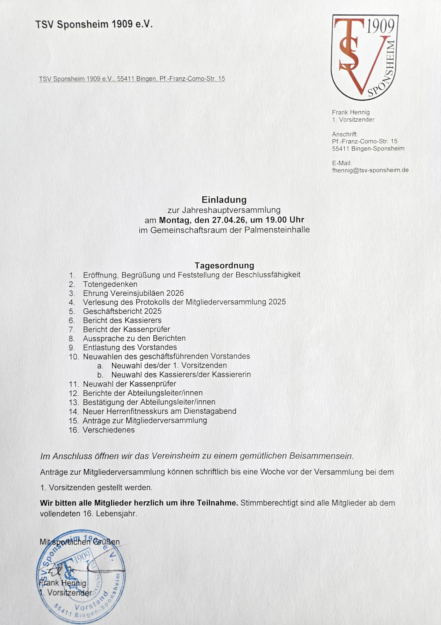 Wir laden unsere Mitglieder herzlich zur Jahreshauptversammlung am Montag, den 27. April 2026 um 19.00 Uhr in den Gemeinschaftsraum der Palmensteinhalle ein!